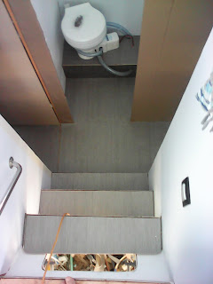 Retour à l'intérieur, en plus de me donner un coup de main pour le safran (et c'était assez chaud), Magali a continué la peinture et le collage du sol de la coque bâbord. Les marches de la descente ont aussi droit à leur déco. Les toilettes sont terminés. Une petite soudure et elle seront fonctionnelles.